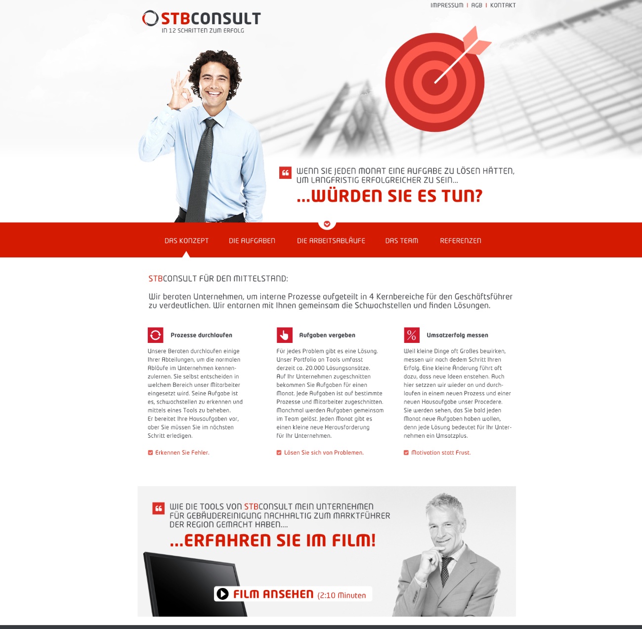Aufgabenbeschreibung: STB Consult berät Unternehmen, die sich weiterentwickeln möchten. Eine Beratung umfasst ein 1-tägiges Screening im Unternehmen. Dabei werden mittels eines Schulnotensystems alle Unternehmensbereiche bewertet. Anschliessend bekommt das Unternehmen verschiedene Hausaufgaben, um sich in den schlechter bewerteten Bereichen zu verbessern. Hintergrund ist die Tatsache, dass in verschiedensten Unternehmen, häufig die selben Probleme existieren. STB Consult bedient sich dabei eine großen Liste an Tools und wendet diese individuell auf das Unternehmen abgestimmt an. Bearbeitet werden 4 Bereiche: "C" steht für Chef, "K" steht für Kunde, "M" steht für Mitarbeiter und "P" steht für Prozesse. Die Aufgabe der Agentur war es, diese Beratungsleistung zu erklären und mittels der Webseite zu kommunizieren. Aussagen sollten verdichtet werden und Bilder sollten diese Aussagen unterstreichen.